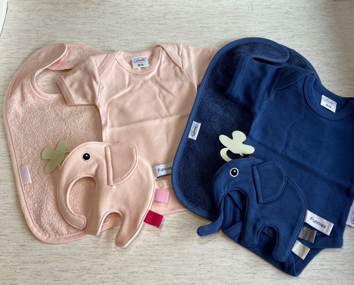 Een lief kraamcadeautje voor een tweeling door de brievenbus. De katoenen romper en badstof slabben zijn van Funnies.