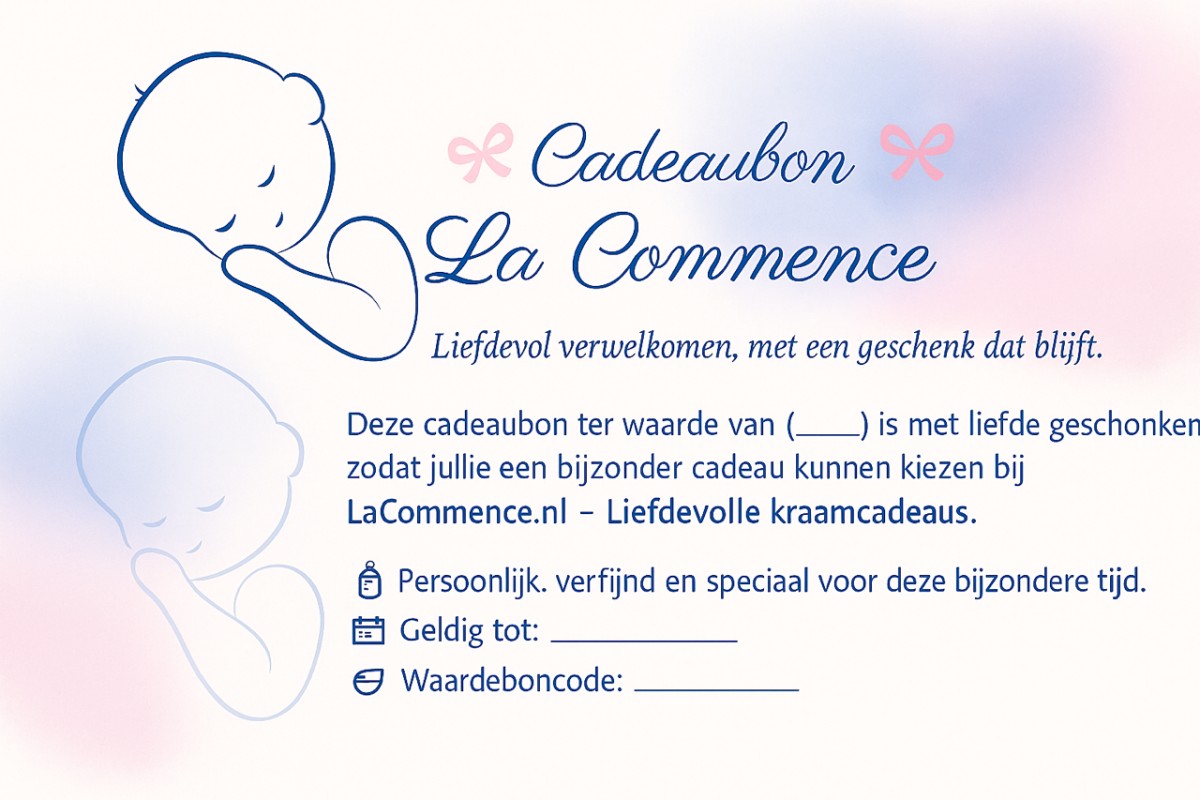 Vind je het leuk om iets te geven, maar is het moeilijk om een keuze te maken? Of wil je de keuze geven aan de ontvanger wat die nog nodig heeft? Geef een cadeaubon van La Commence. De ontvanger kan dan zelf iets uitzoeken in de webwinkel en bestellen.